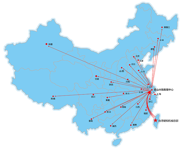 昆山嘉尼赫機(jī)械有限公司為臺(tái)灣鍵和機(jī)械股份有限公司在大陸設(shè)定的唯一子公司,本公司于2010年4月在昆山仕泰隆模具城成立,應(yīng)市場(chǎng)需求于2015年2月搬遷至昆山周市鎮(zhèn)成立鍵和中國售服中心。設(shè)有獨(dú)立的零配件倉庫及機(jī)臺(tái)大修車間,機(jī)臺(tái)樣機(jī)展示廳。